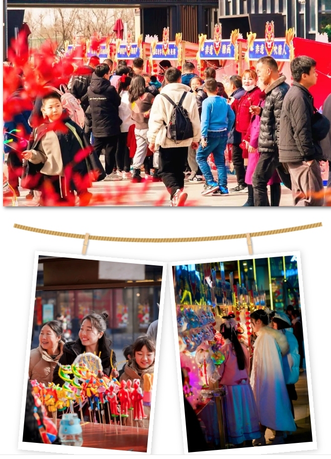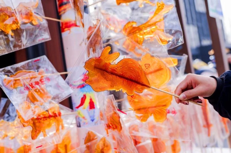 欣赏完精彩的民俗表演,再走进非遗展示与美食文创的奇妙世界一探究竟。在这里,糖画艺人以勺为笔、以糖为墨,快速勾勒出活灵活现的动物、花卉等;剪纸艺人手中的剪刀飞舞,一幅幅剪纸作品栩栩如生;手作花灯区域,你可以亲自参与制作,为自己订制一盏新年花灯。