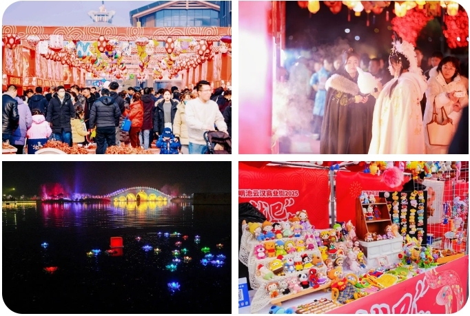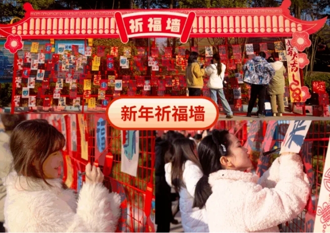 在棉婚雕塑旁,可以参与猜灯谜活动,感受传统文化的魅力;在灵波剧场旁的下水步道,放河灯祈福活动邀您寄托美好心愿;景区内的积草园和天地长廊处设置了新春美食节,众多美食摊位提供快餐、饮品等丰富选择,供您选择。
