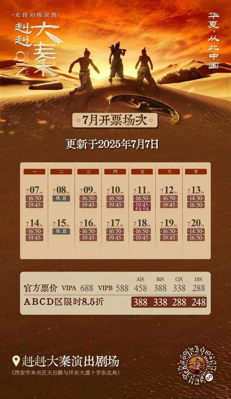 关注剧场官方服务号“赳赳大秦”进行购票,也可通过官方抖音、美团、猫眼、大麦、携程等平台及剧场票务中心前台购买演出票。
