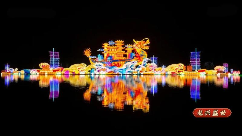 百米水上巨型灯组“龙兴盛世”以龙船造型为主,金色的龙船乘风破浪,周围大小船只扬帆起航,寓意“百舸争流千帆竞”,希望大家在新的一年里都能勇立潮头。