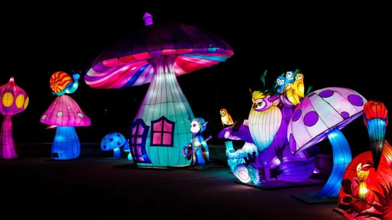 在这片花灯“森林”里,蘑菇屋、各类奇花异草、飞禽走兽等应有尽有。