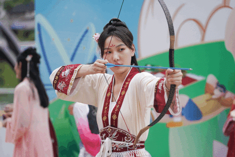 “五一”没能去露营,这次可不能错过。刚下班的陈志翠急急忙忙换上汉服,和家人一起赶到露营基地参加国风雅集,带孩子体验“君子六艺”中的射艺。“五一”假期看到朋友圈里露营刷屏,她就对露营念念不忘,此次西咸新区举办的露营音乐节刚好弥补了她的遗憾。“露营以最近的距离、最小的成本满足了城里人的诗与远方,让大人和孩子都能在大自然里得到放松与肆意。”