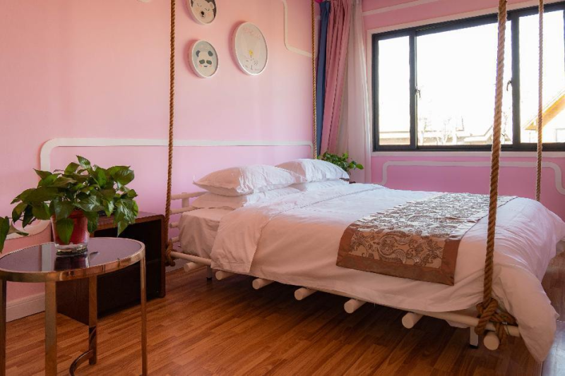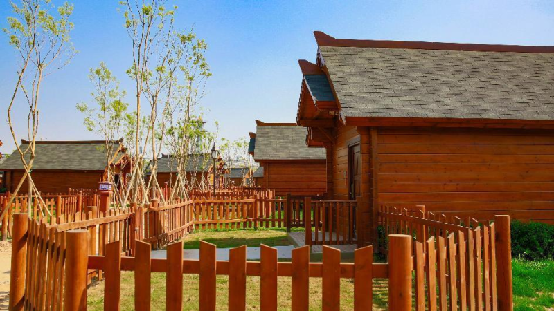 坐落在秦汉园里的楚汉木屋民宿则是返璞归真:院落式设计,全木制建筑,以茅草盖面做屋顶,就连门牌的设计也别具匠心。房前屋后绿草如茵,庭院中虫鸣鸟叫,让人恍如隐居田园。
