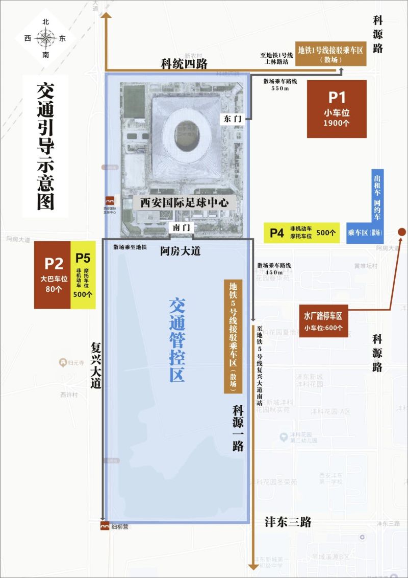 为保障赛事期间道路通行顺畅,9月6日16:30至23:00,西安国际足球中心周边多条道路将实施临时交通管控。其中,科源一路(科统四路至沣东三路段)、阿房大道(复兴大道至科源一路段)、复兴大道(统一西路至沣东三路段)、科统四路(复兴大道至科源路段),禁止无本次活动证件的车辆通行与停放;科源一路(沣东三路至沣东大道段)、阿房大道(科源一路至科源路段)、复兴大道(沣东三路至沣东大道段),将根据现场交通状况实施临时管控,禁止机动车通行与停放。