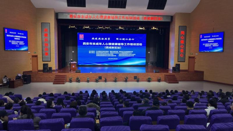 12月6日下午,由中共西安市委文明办、西安市教育局、西安市卫生健康委员会联合主办,西安市精神卫生中心(西安市未成年人心理健康辅导中心)和西咸新区教育体育局、宣传文旅局、社会事业服务局联合承办的西安市未成年人心理健康辅导工作培训活动(西咸新区站)在西咸新区秦汉中学顺利举办。西咸新区教育体育局、宣传文旅局、社会事业服务局分管负责同志,全区中小学心理健康负责领导、专兼职心理健康辅导教师以及西咸新区心理人才库志愿者共400余人参加培训。