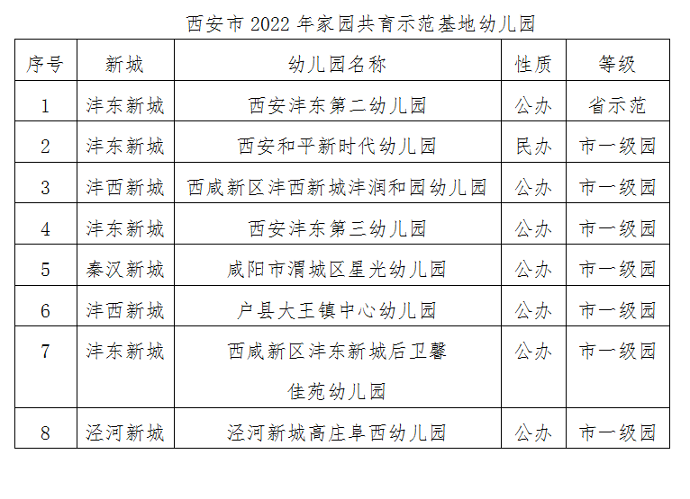 贯彻落实《西安市教育局办公室关于组织申报西安市学前教育第二轮质量提升“345”工程——游戏改革试点幼儿园 家园共育示范基地幼儿园的通知》(市教办发〔2022〕333号)要求,西咸新区教育体育局高度重视,积极组织辖区幼儿园申报并开展评审遴选工作。经新区推荐,市教育局评审认定,西咸新区8所幼儿园成功被认定为“西安市2022年家园共育示范基地幼儿园”。