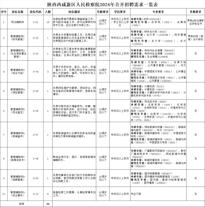 陕西西咸新区人民检察院2024年公开招聘需求一览表