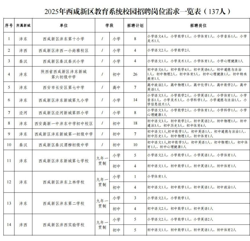 计划为西咸新区14所公办中小学校招聘教师137人,具体岗位及人数见《2025年西咸新区教育系统校园招聘岗位需求一览表》。